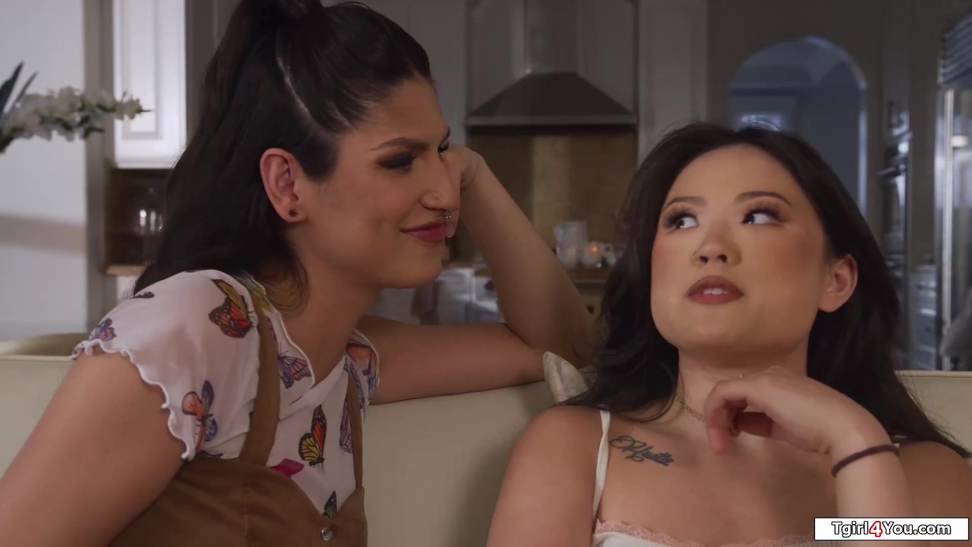 Asian Lulu Chu dares shemale gf Zariah Aura to creampie her.The latin tgirl jerks her big tranny cock while licking pussy.The small tits oriental babe deepthroats her trans dick.The brunette transsexual stuffs her boner up her girfirends snatch