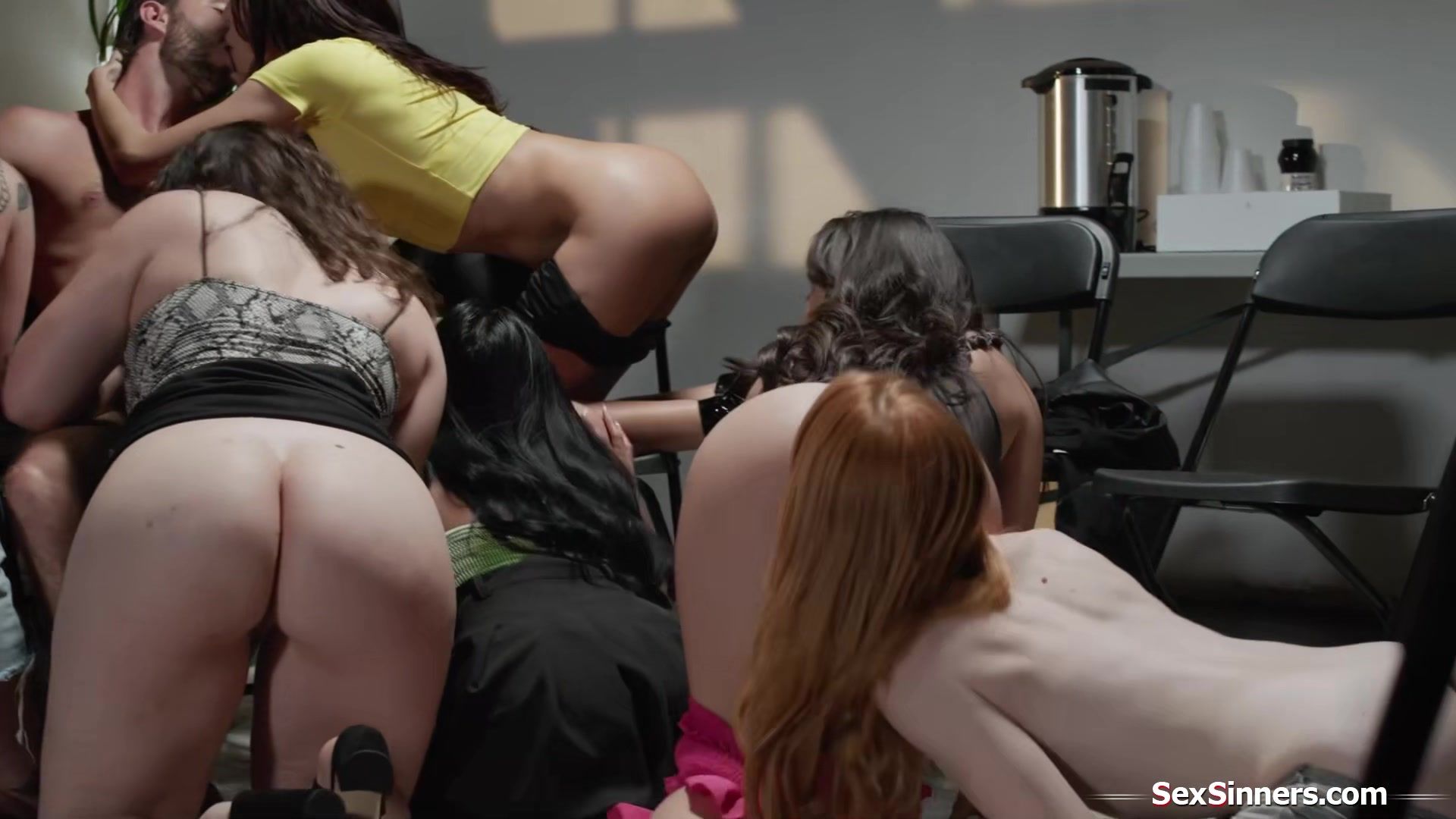 You dont put a guy in the same room with seven sexaddicts.The ladies deepthroat his big cock and the small tits asian rides and squirts multiple times.While the other lick pussy and get fucked the tattooed latina gets her shaved snatch fisted
