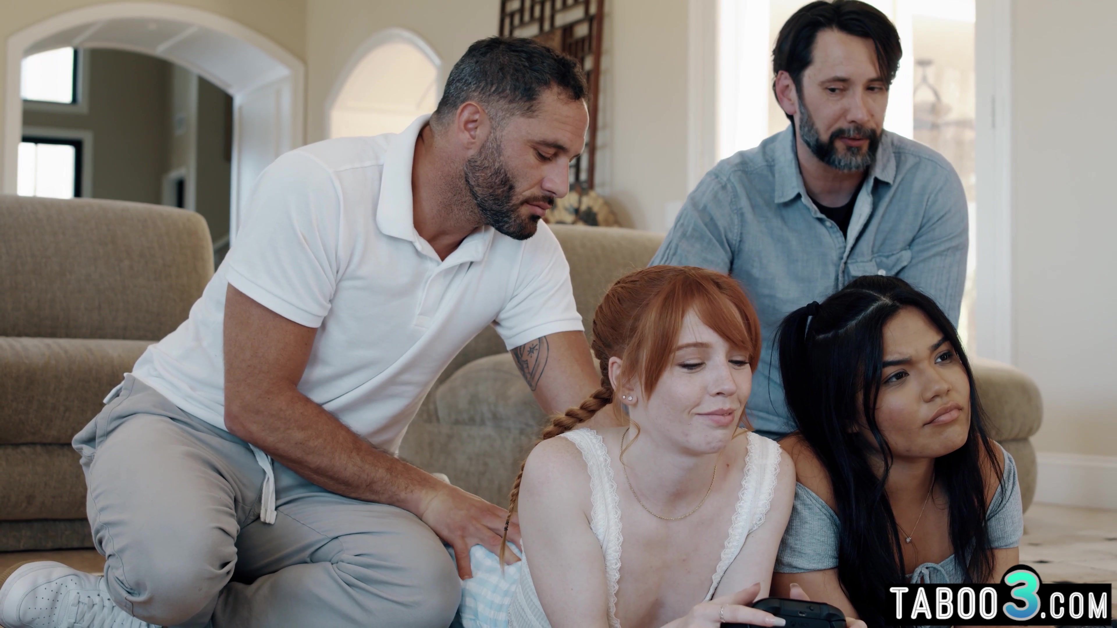 Perv stepfathers want to anal fuck each others stepdaughters so they have a nasty plan to lure them into taboo foursome fuck but the naughty sluts Madi Collins and Summer Col dont need too much motivation they take the big dicks to fuck them hard